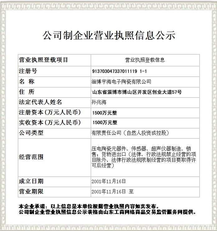淄博宇海電子陶瓷有限公司位于淄博市博山開發(fā)區(qū)創(chuàng)業(yè)大道57號(hào),始建于1966年,2001年11月由國(guó)營(yíng)淄博無(wú)線電瓷件廠改制為淄博宇海電子陶瓷有限公司。公司是生產(chǎn)壓電陶瓷元件的專業(yè)廠家,是中國(guó)電子元件行業(yè)協(xié)會(huì)創(chuàng)始會(huì)員、山東省先進(jìn)陶瓷創(chuàng)新創(chuàng)業(yè)共同體理事單位。